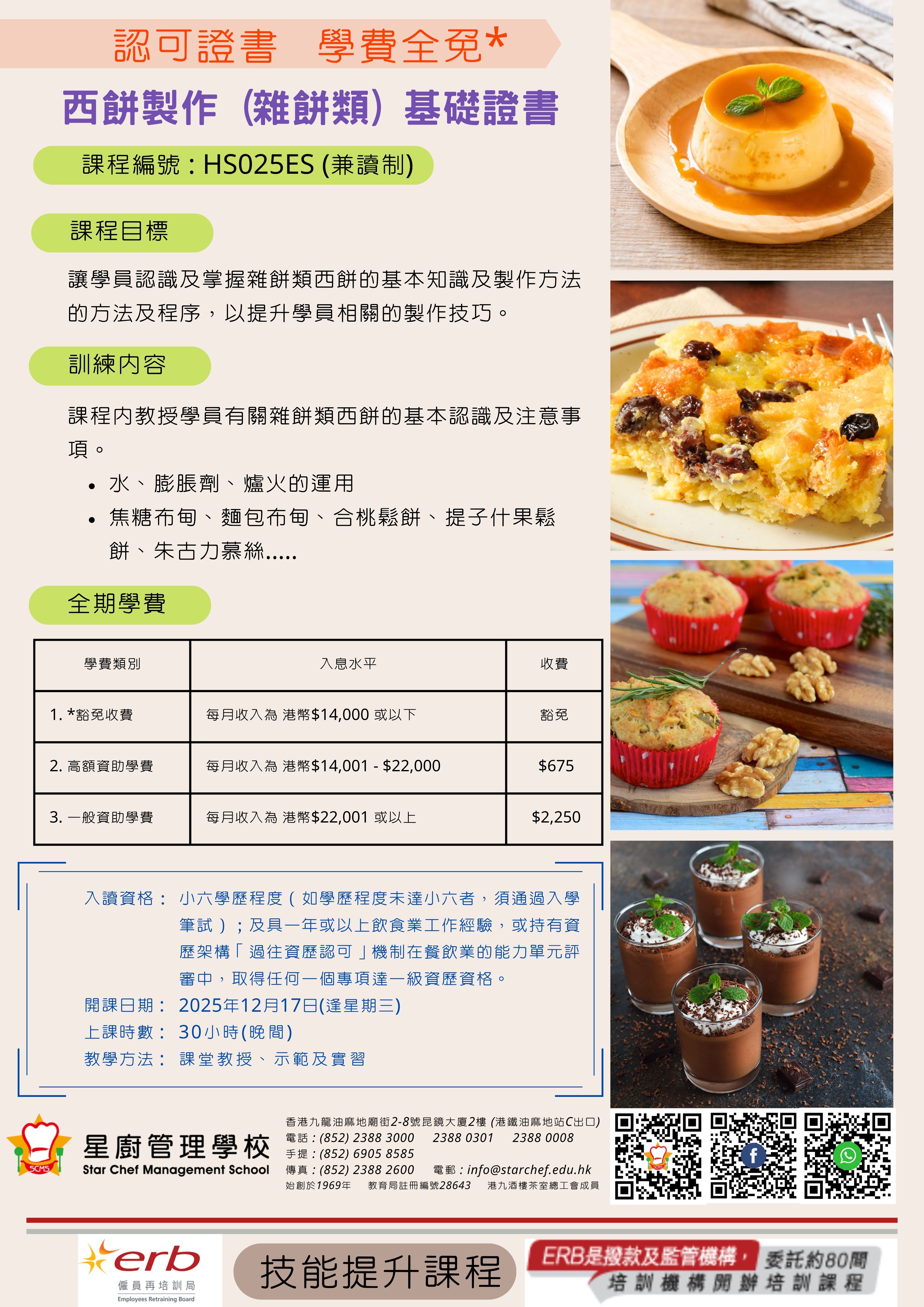 ERB ** 免學費 + 有津貼系列 ** 西餅製作 (雜餅類) 基礎證書 (兼讀制)